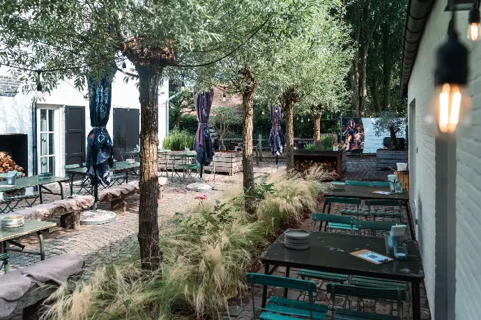 Ons terras is een ruime openkoer, ideaal om te genieten van een aperitief of een buitenreceptie bij mooi weer. Het is de perfecte locatie om je gasten te verwelkomen en te laten genieten van de buitenlucht.